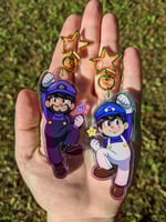 Choose between your favorite meme heroes or grab both! These keychains measure 3'' tall and are made from glittery gradient acrylic and stainless steel gold clips.