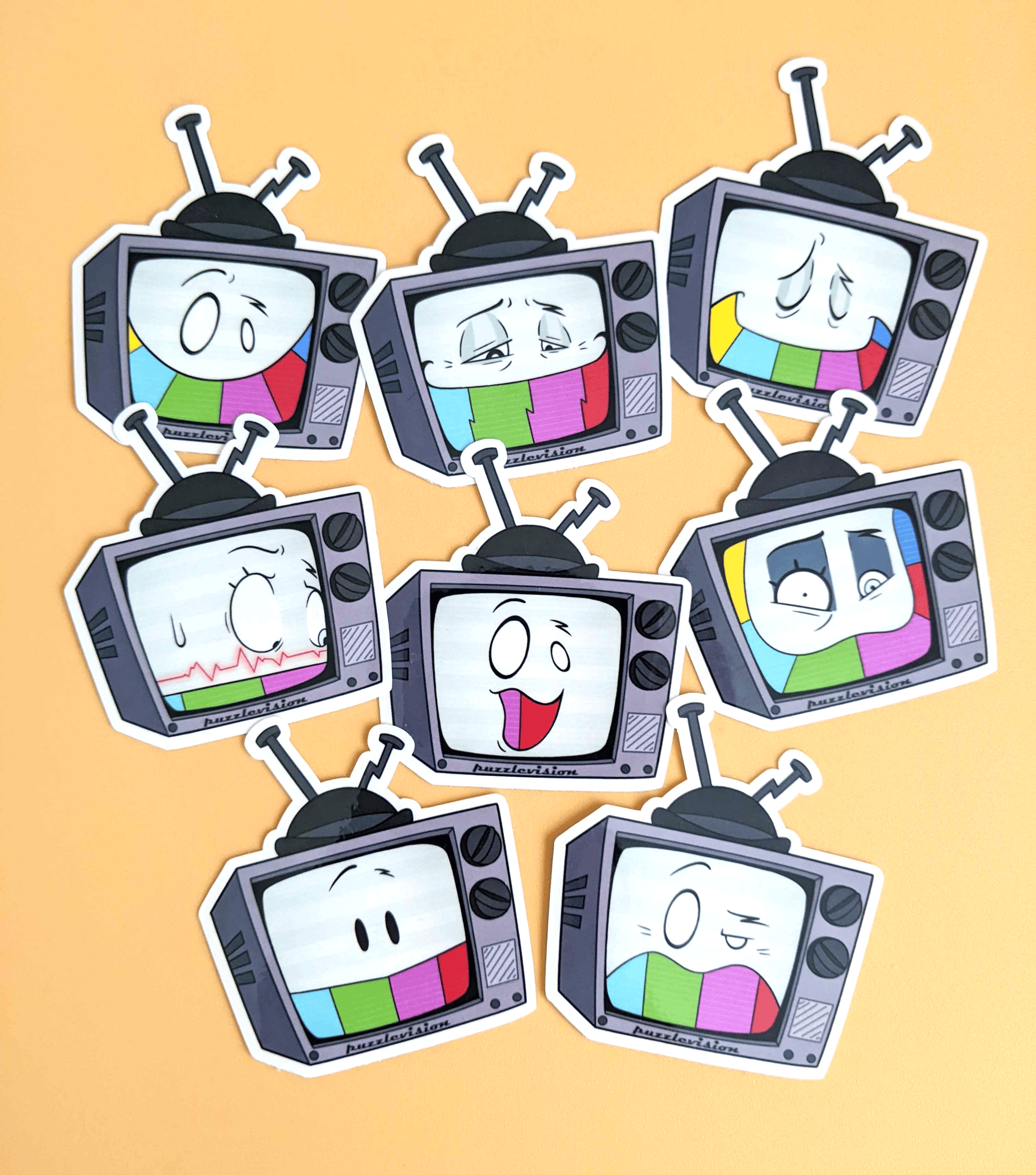 For the loyal fans of Puzzlevision, now YOU can bring your favorite humble host anywhere you go! Whether you're feeling peachy keen or ready to explode due to overwhelming stress, we've got a sticker for you!